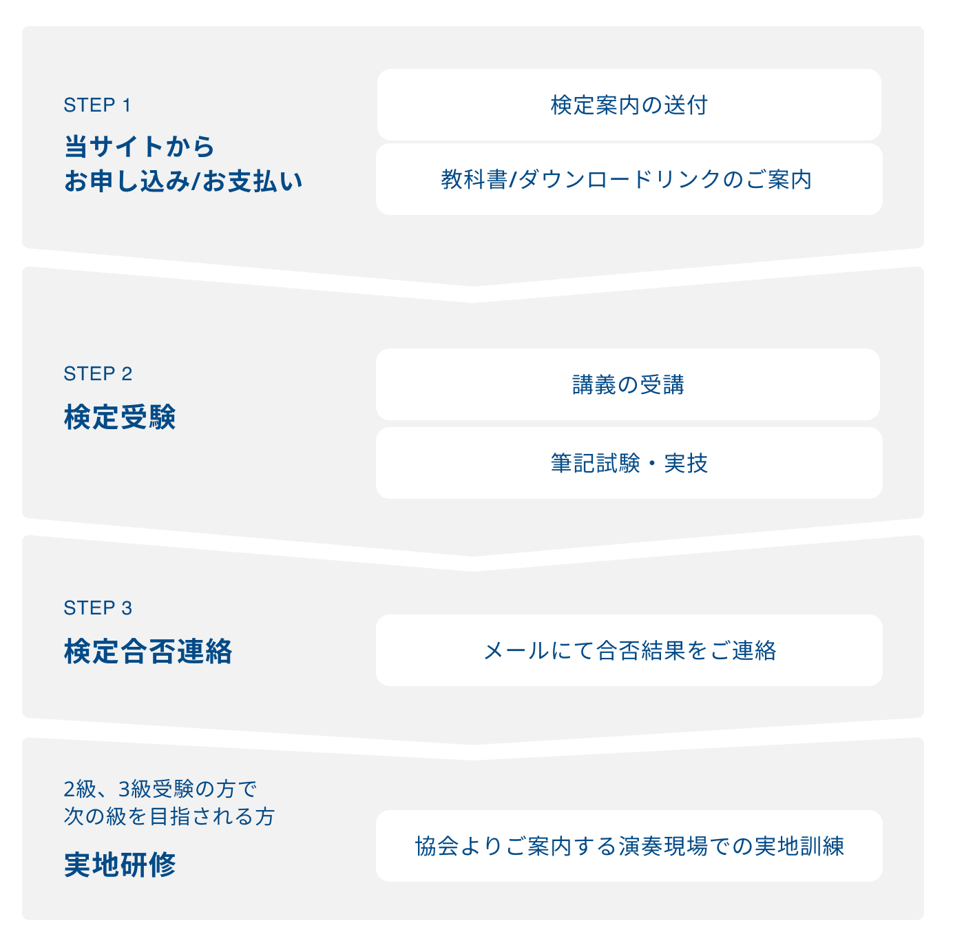 JB Music検定は会場にて約半日で行われます。前半に検定講習を行い、後半で検定試験として筆記試験と実技試験を行います。